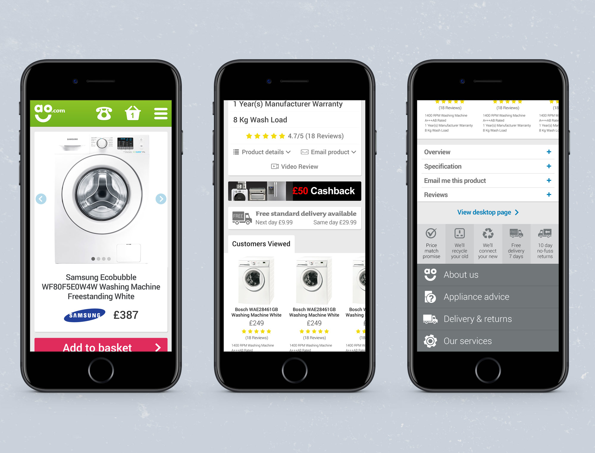 Working on the first version of the mobile product page for ao.com. Design was based on market research, data from mobile usage and what customers were most interested in knowing while shopping for a product.